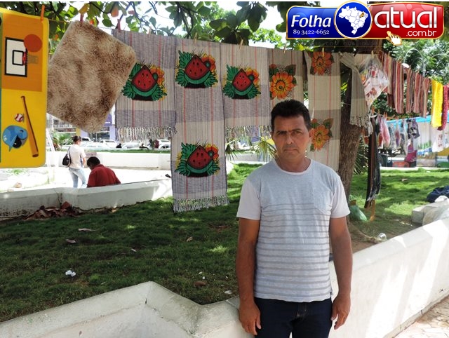 José Ocean que vende tapetes de diversos materiais encontrou uma forma criativa de expô-los na Praça, amarrando uma corda no tronco das árvores, uma espécie de varal, que se tornou o mostruário do negócio.