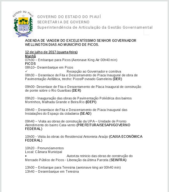 De acordo com a agenda divulgada, Wellington Dias (PT) deve desembarcar na Capital do Mel às 08h10min. Do aeroporto de Picos, o governador e comitiva seguem para as inaugurações de obras financiadas pelo tesouro estadual.