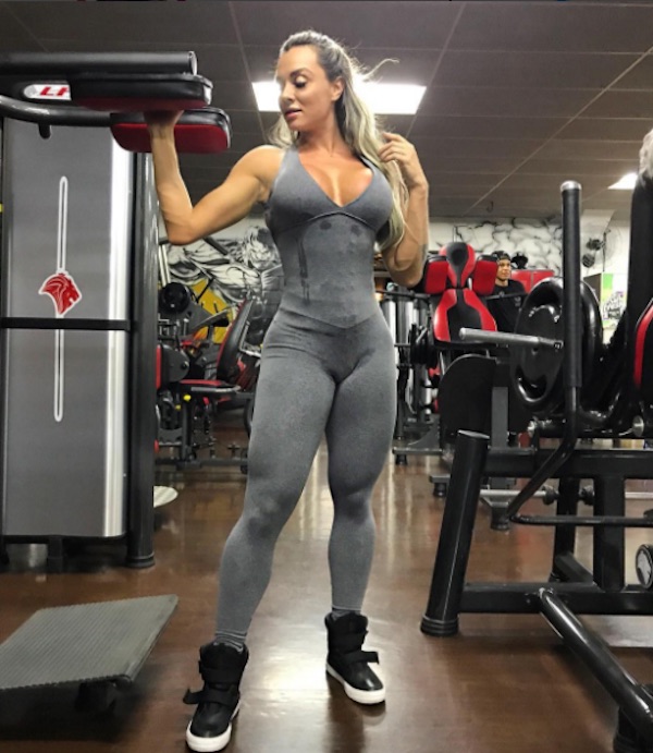 O macacão cinza deixou os famosos músculos das pernas de Juju à mostra. Decotada, a roupa também evidenciou as novas próteses de silicone da loira. Por baixo, é possível ver a cinta usada pela beldade durante o treino.