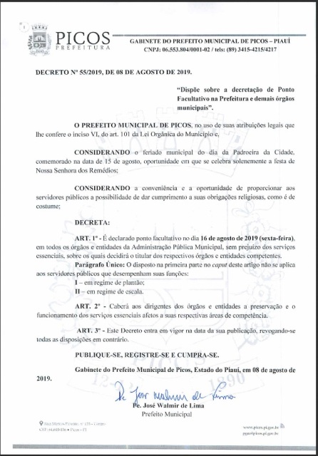 O prefeito de Picos, Padre Walmir, decretou ponto facultativo nesta sexta-feira, 16 de agosto, em todos os órgãos da administração pública municipal, exceto para aqueles servidores que desempenham as suas funções em regime de plantão ou escala. O decreto foi assinado considerando o feriado municipal do dia da padroeira da cidade, Nossa Senhora dos Remédios, comemorado no dia 15 de agosto.