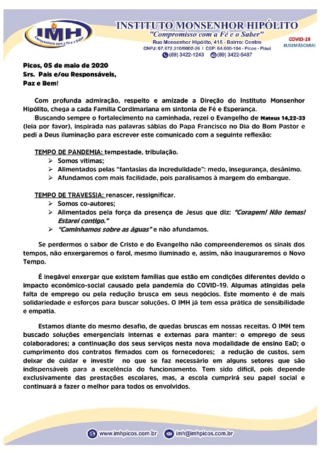 O Instituto Monsenhor Hipólito (IMH), ‘Compromisso com a Fé e o Saber’, em Picos, é uma das instituições de ensino que está enfrentando a grave crise gerada pela pandemia do novo coronavírus (COVID-19).