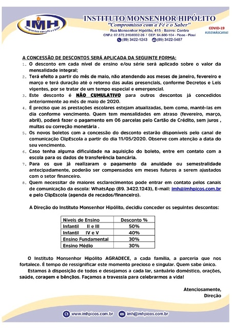 Para amenizar a crise, a direção do Instituto Monsenhor Hipólito, que integra a Rede Cordimariana, juntamente com a equipe administrativa, decidiu conceder descontos em mensalidades para as famílias que tem seus filhos matriculados nos níveis de ensino ofertados.