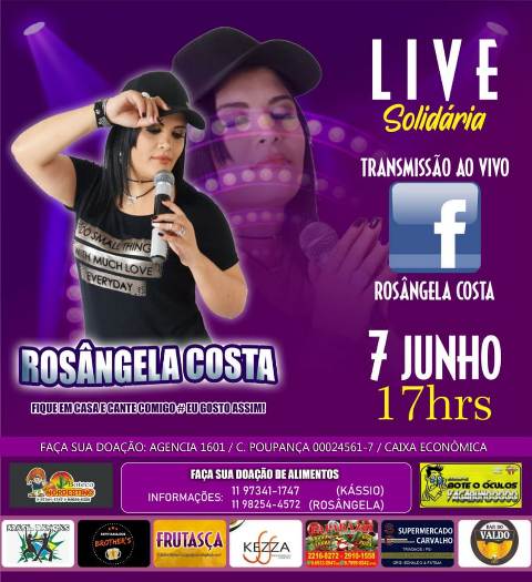 A cantora picoense, Rosângela Costa, irá realizar neste domingo, 07 de junho, a partir das 17h00, uma Live Solidária. Além de levar alegria para as famílias que estão em casa, a ação busca também arrecadar alimentos que serão doados principalmente para profissionais que tiram seus sustentos através da música e que em razão da pandemia estão neste momento com seus orçamentos financeiros comprometidos.