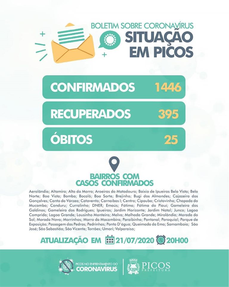 •Picos (07 positivos e 03 suspeitos ), Sussuapara (01 positivo e 01 suspeito), Bocaina (01 positivo), Santa Cruz do Piauí (01 positivo), Francisco Santos (01 positivo), Alegrete (01 positivo), Pimenteiras (01 positivo), Padre Marcos (01 suspeito) e Jaicós (01 suspeito).