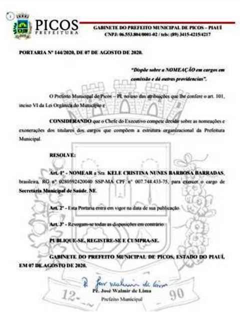 O prefeito de Picos, padre José Walmir de Lima (PT), nomeou na última sexta-feira, 07 de agosto, a nova secretária de saúde de Picos. O cargo, antes ocupado pelo bioquímico Waldemar Santos Júnior, o Dr. Júnior, passa a ser conduzido pela médica Kele Cristina Nunes Barbosa Barradas.