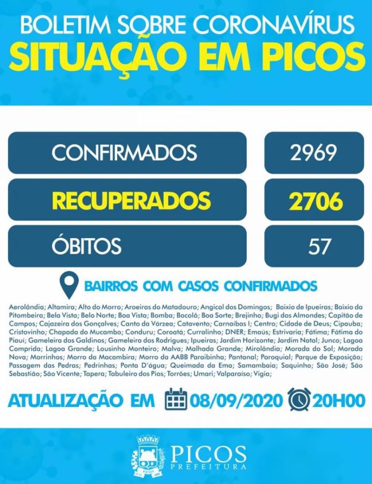 A cidade de Picos continua registrando um aumento diário de casos da Covid-19. Na noite desta terça-feira (08) a Secretaria Municipal de Saúde divulgou boletim epidemiológico em que o número de positivados se aproxima dos 3 mil, atingindo a marca de 2.969 pessoas infectadas pelo novo vírus.