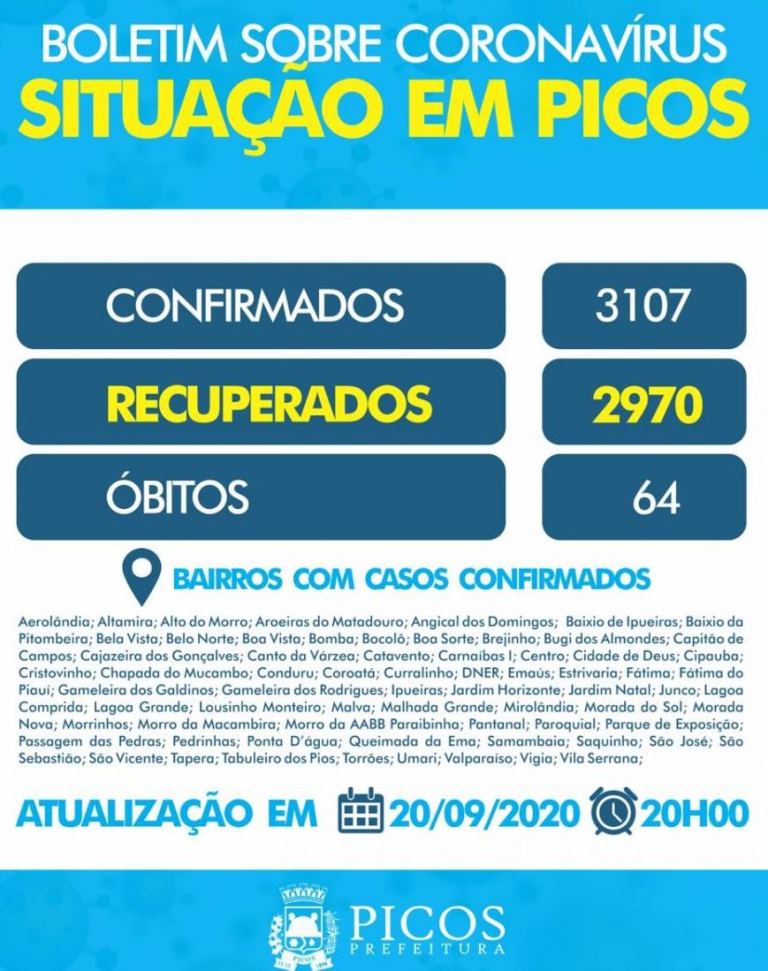 Os registros de casos positivos da Covid-19 tem atingindo 68 comunidades picoenses entre área rural (38) e sede urbana (30).