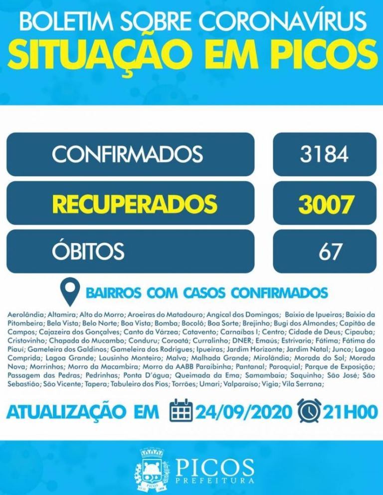 Nesta quinta-feira (24) o município de Picos registrou mais uma morte por Covid-19. Segundo o boletim epidemiológico divulgado pela Secretaria Municipal de Saúde, 67 picoenses já vieram a óbito decorrentes de complicações do novo vírus.