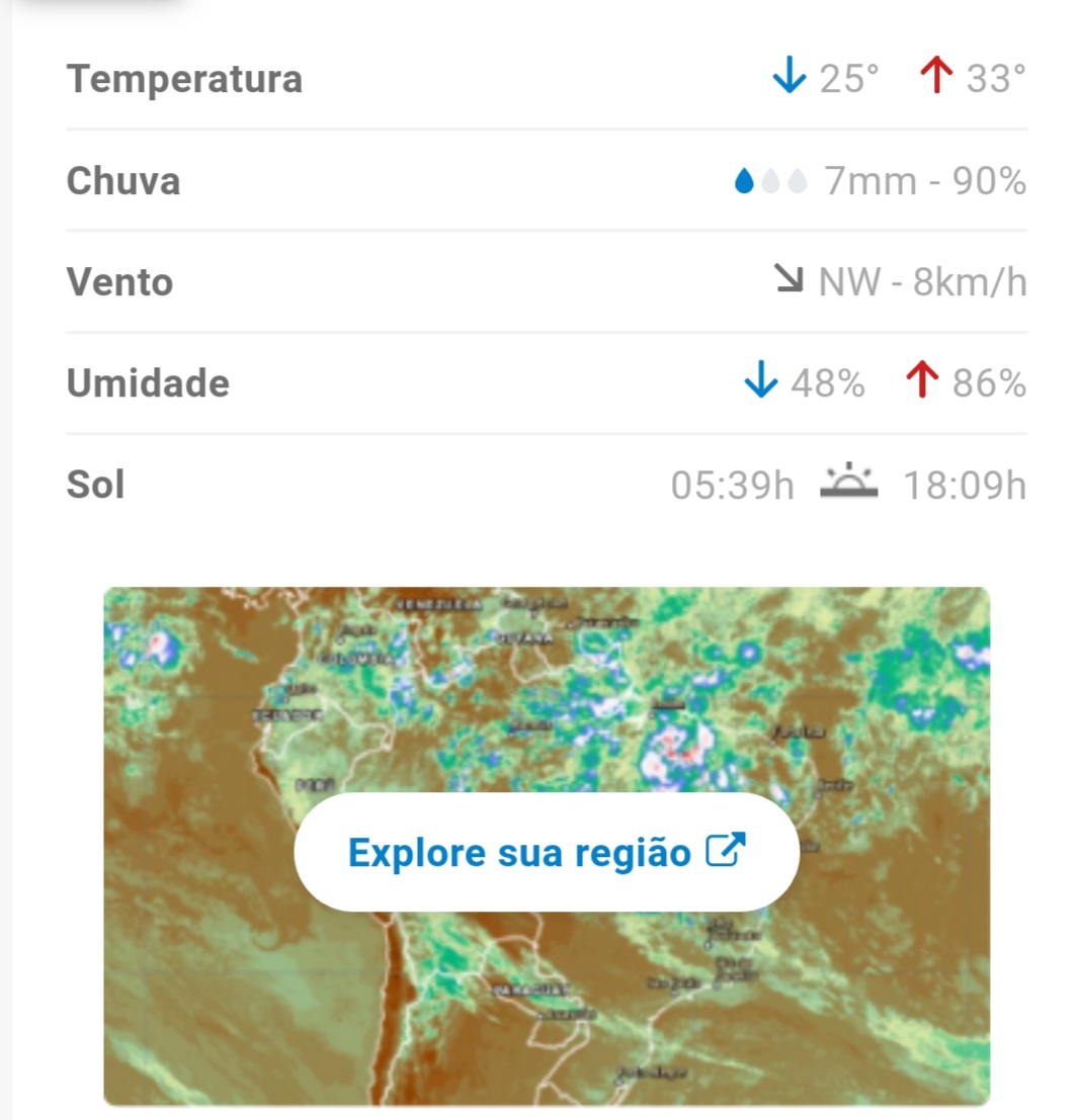 A mudança no clima também favoreceu para a queda de temperatura, onde a mínima nesta terça é de 25°C e a máxima de 33°C.