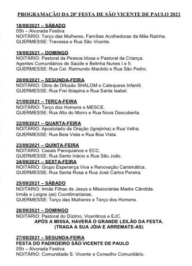 Foi aberto na noite deste sábado, 18 de setembro, a 28ª Festa do Padroeiro São Vicente de Paulo, no Bairro São Vicente, em Picos. Durante as nove noites que antecedem a Missa Solene da Festa, os fiéis são convidados a participar ao meio dia do Ofício da Imaculada Conceição; às 18h15 da Reza do Terço e às 19h00 de novena/missa.
