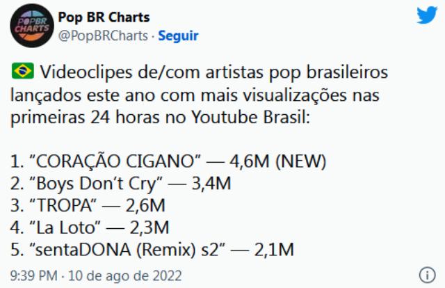 A parceria entre Luan Santana e Luísa Sonza, no single “coração cigano”, acaba de conquistar o título de videoclipe de um artista brasileiro mais assistido nas primeiras 24 horas em 2022.