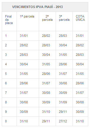 O IPVA poderá ser pago em até três parcelas. As datas de vencimento das parcelas são distribuídas de acordo com o final da placa (veja tabela abaixo). O governo concederá desconto de1 5% para o pagamento à vista.
