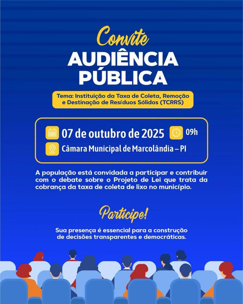A Prefeitura de Marcolândia, por meio do prefeito Dr. Corinto Matos, convida toda a população a participar da Audiência Pública que discutirá a Instituição da Taxa de Coleta, Remoção e Destinação de Resíduos Sólidos (TCRRS). O encontro será realizado no próximo dia 7 de outubro, às 9h, na Câmara Municipal.