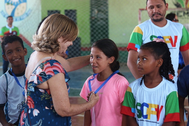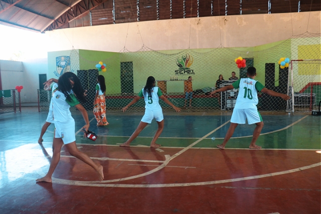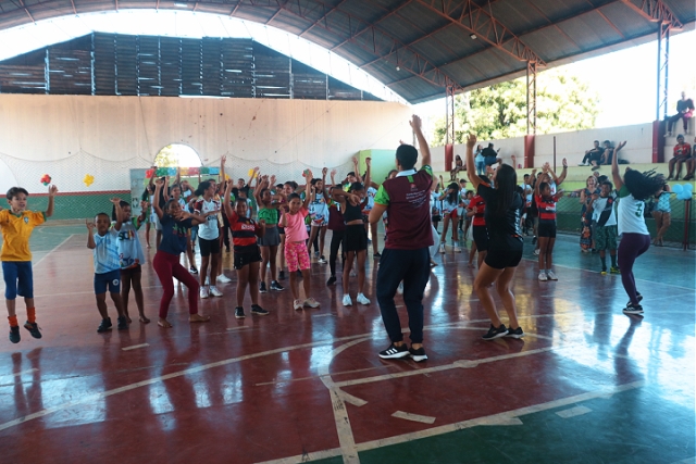 Após o momento cultural, os participantes participaram de um alongamento coletivo e deram início aos jogos esportivos, que incluíram queimada infantil, futebol infantil masculino e feminino, queimada dos adolescentes e três partidas de futebol entre adolescentes.