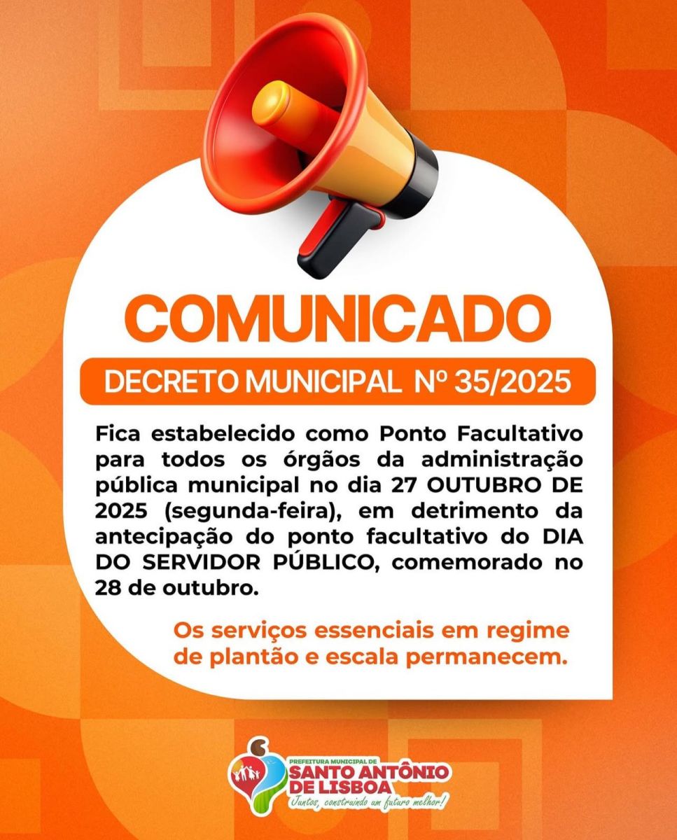 O prefeito de Santo Antônio de Lisboa, Erivaldo Lopes, emitiu um Decreto N° 035/2025 onde declara ponto facultativo na próxima segunda-feira, dia 27 de outubro, em razão da comemoração do Dia do Servidor Público.