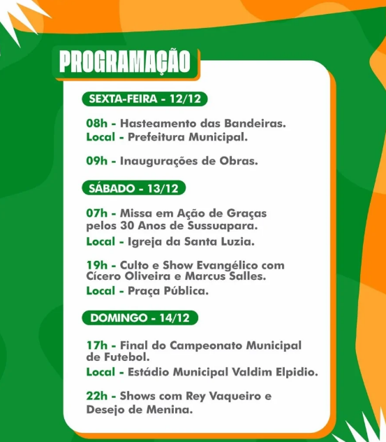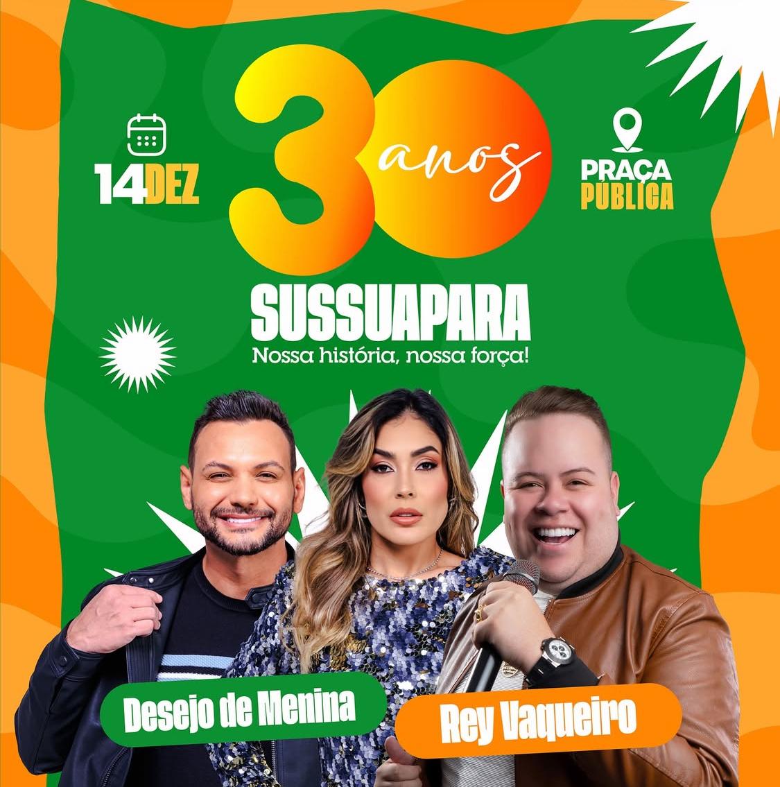 As comemorações seguem no domingo, 14 de dezembro, data oficial do aniversário de Sussuapara. Pela manhã e tarde, acontece a Final do Campeonato Municipal de Futebol, reunindo torcedores e atletas locais. Encerrando as festividades, a noite terá a grande comemoração dos 30 anos, com shows de Rey Vaqueiro e Desejo de Menina, prometendo atrair uma multidão para celebrar esse marco histórico.
