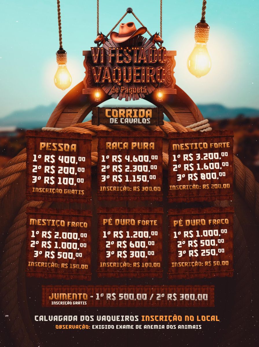 A programação contará com a Corrida de Cavalos, que terá premiações em dinheiro em diversas categorias, reunindo vaqueiros e criadores da região, além da tradicional Cavalgada dos Vaqueiros, que reforça o espírito de união e a preservação das tradições locais. As inscrições serão realizadas no local, com exigência de exame de anemia dos animais.