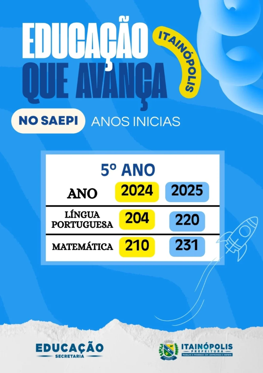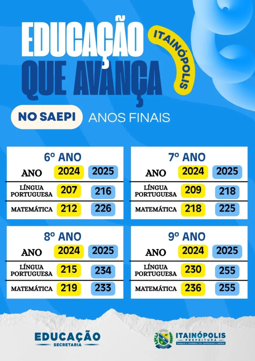 A Prefeitura de Itainópolis, sob a gestão do prefeito Miguel Rodrigues, por meio da Secretaria Municipal de Educação, comandada pela secretária Maria do Socorro Ribeiro, comemora os resultados positivos obtidos nas avaliações do Sistema de Avaliação Educacional do Piauí (SAEPI) 2025. Os dados comparativos com 2024 apontam avanços significativos nos Anos Iniciais e Finais do Ensino Fundamental.