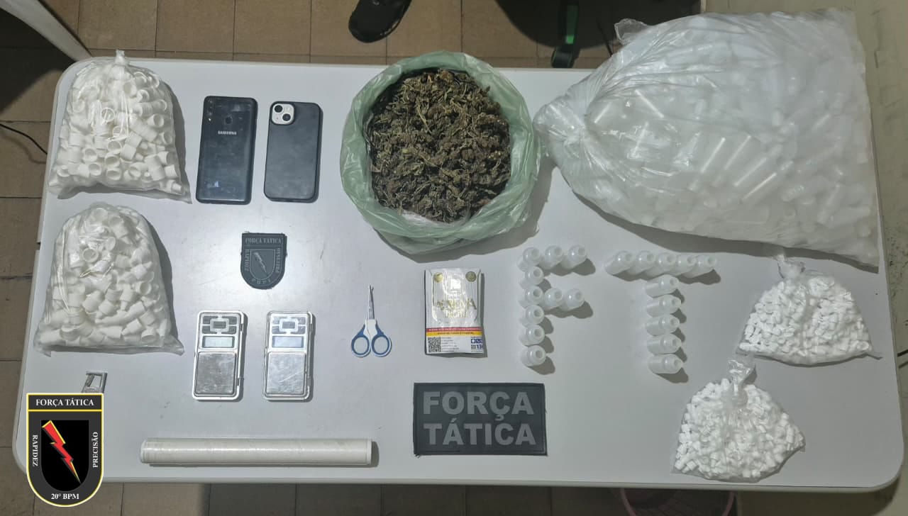 No quarto, foram apreendidos aproximadamente 442 gramas de substância análoga à maconha, além de duas balanças de precisão, um rolo de papel filme, uma tesoura, um pacote de tabaco e 419 frascos plásticos com tampa e dosador. A quantidade de recipientes chamou a atenção dos policiais, levantando a suspeita de que o material seria utilizado para acondicionamento de substância conhecida popularmente como “loló” ou lança-perfume, com possível destino ao consumo e à venda durante o carnaval na cidade.