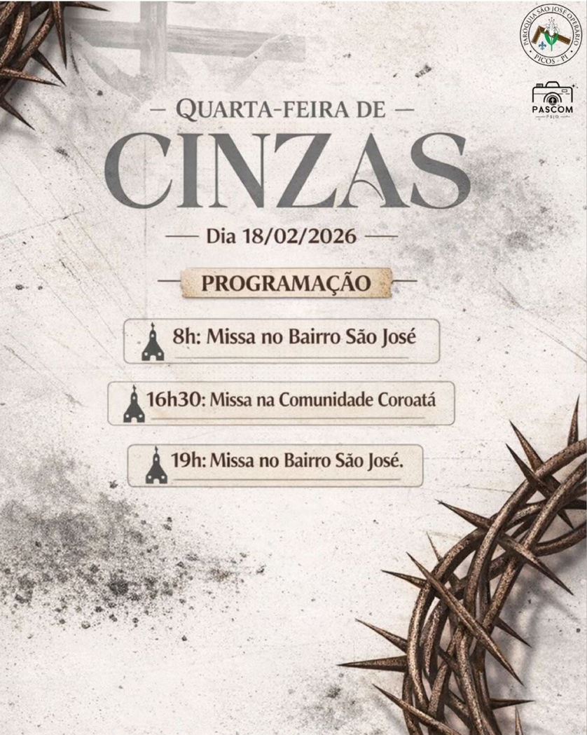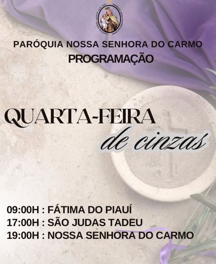 Já na paróquia Nossa Senhora do Carmo, recentemente criada em Picos, três celebrações da Quarta-feira de Cinzas marcarão o dia. Às 9h, em Fátima do Piauí; 17h, na Igreja São Judas Tadeu e às 19h, na Igreja Nossa Senhora do Carmo.