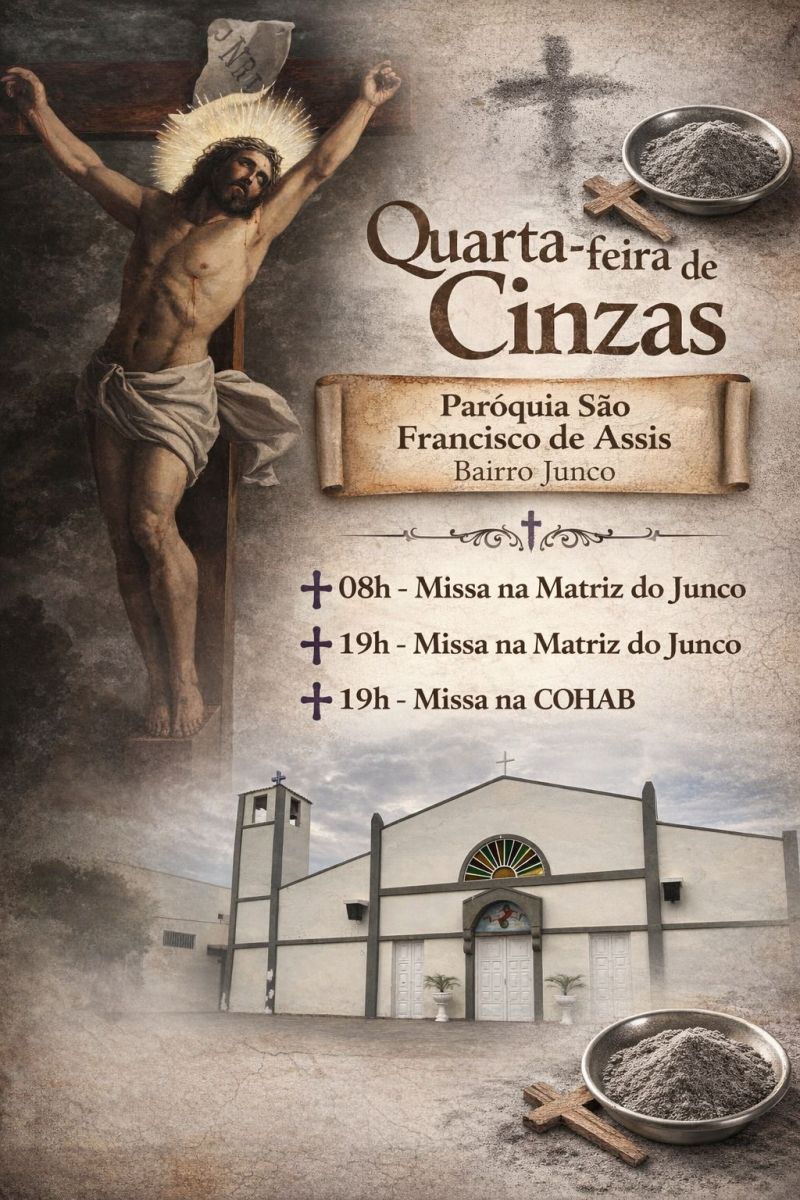 No Bairro Junco, a paróquia de São Francisco de Assis também irá celebrar a Quarta-Feira de Cinzas, às 08h e às 19h, na Igreja de São Francisco, e também a noite, às 19h, na Cohab.