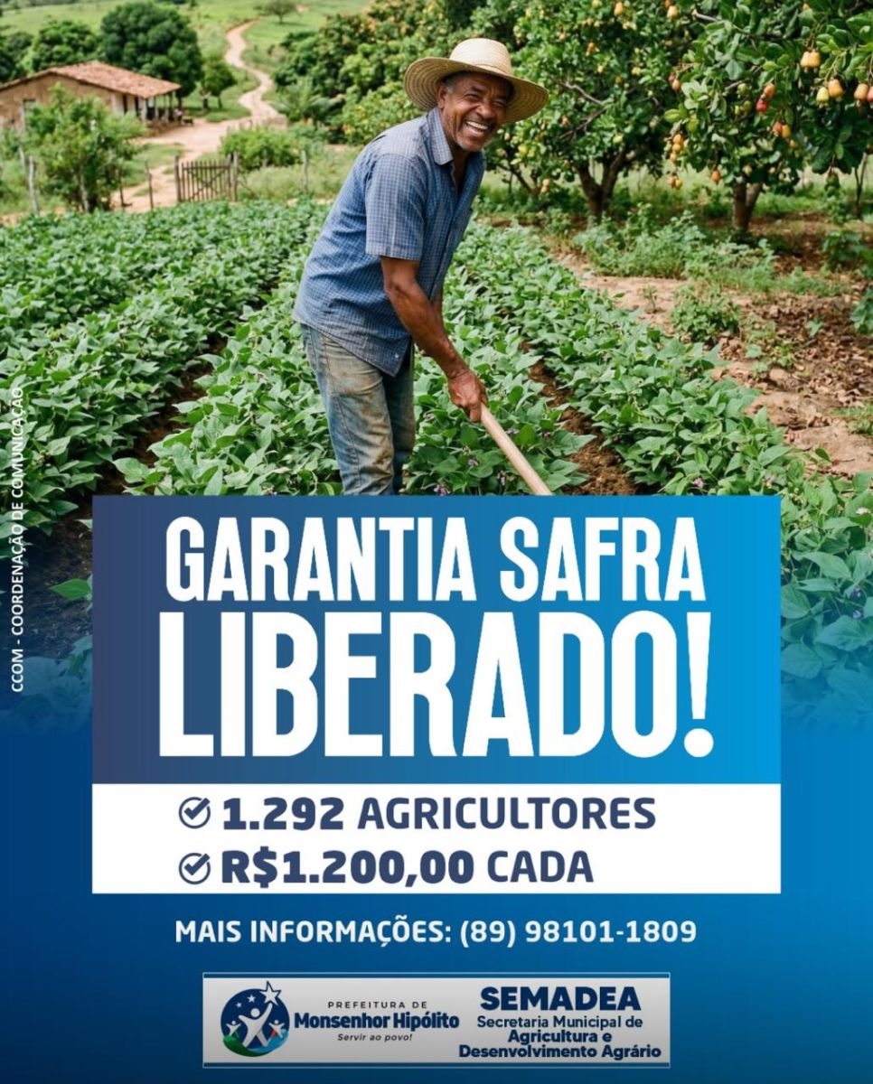 A Prefeitura de Monsenhor Hipólito, por meio do prefeito Djalma Policarpo, anunciou nesta quarta-feira, 18 de março, a liberação de uma parcela do programa Garantia Safra destinada aos agricultores familiares do município.