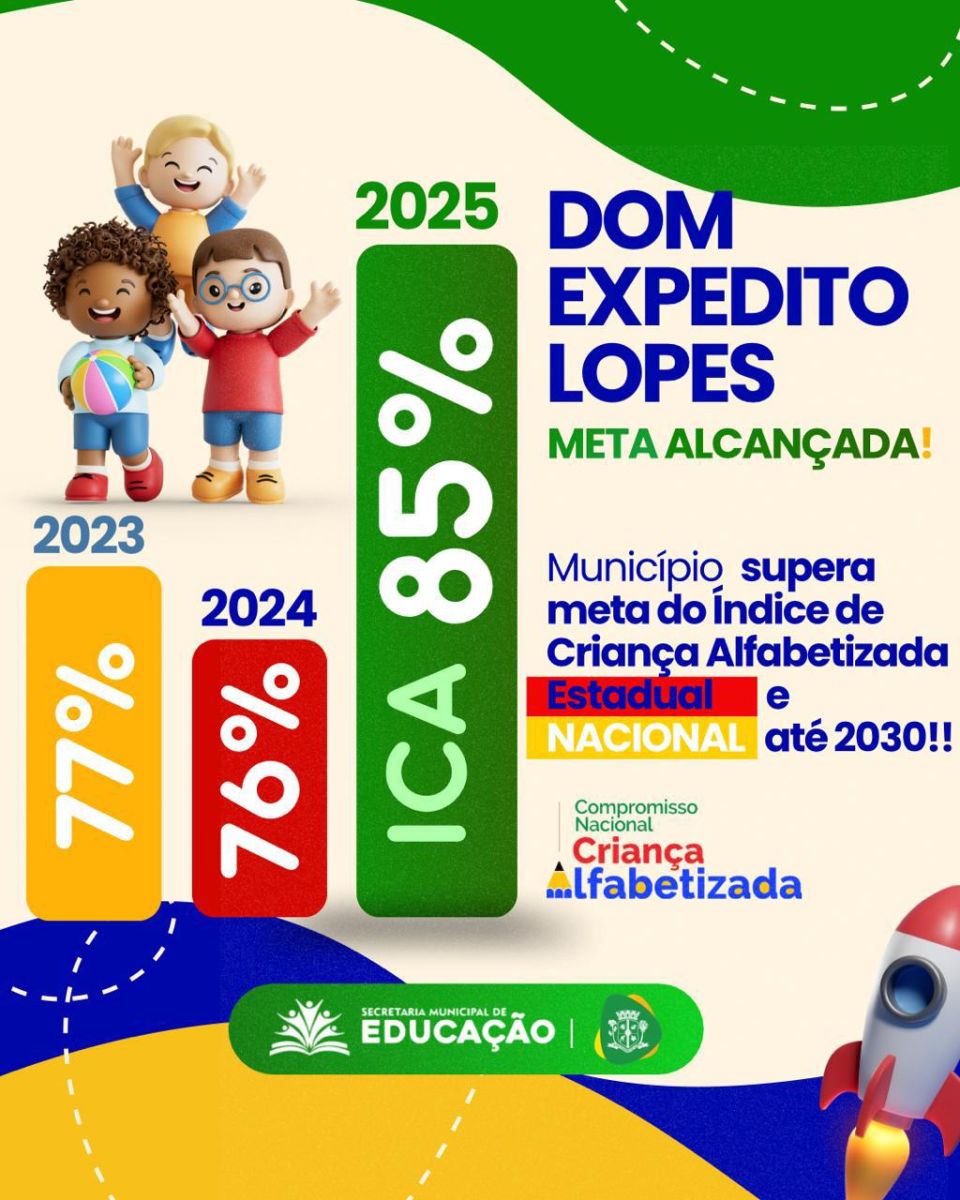 O município de Dom Expedito Lopes celebra um avanço expressivo na educação básica, especialmente no que se refere ao indicador de crianças alfabetizadas na idade certa. Em 2025, o município alcançou o índice de 85% de crianças alfabetizadas, superando significativamente o resultado anterior, de 76%, e consolidando uma evolução consistente na aprendizagem dos estudantes.