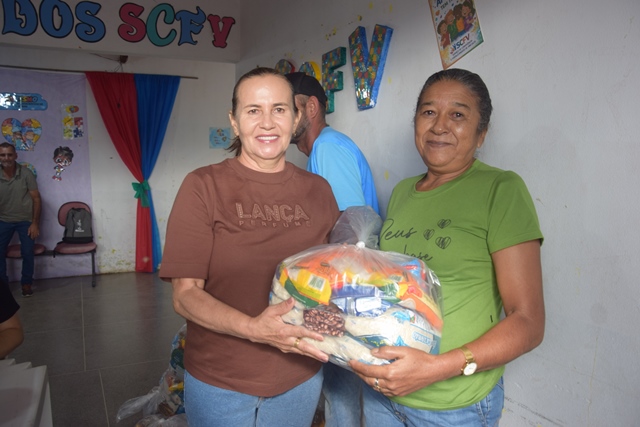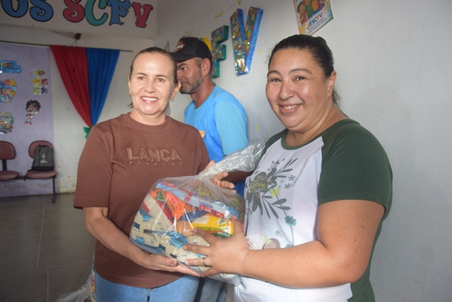As cestas continham itens essenciais para a alimentação, como arroz, açúcar, café, macarrão, sardinha, flocão, óleo e leite, garantindo apoio às famílias neste período importante.