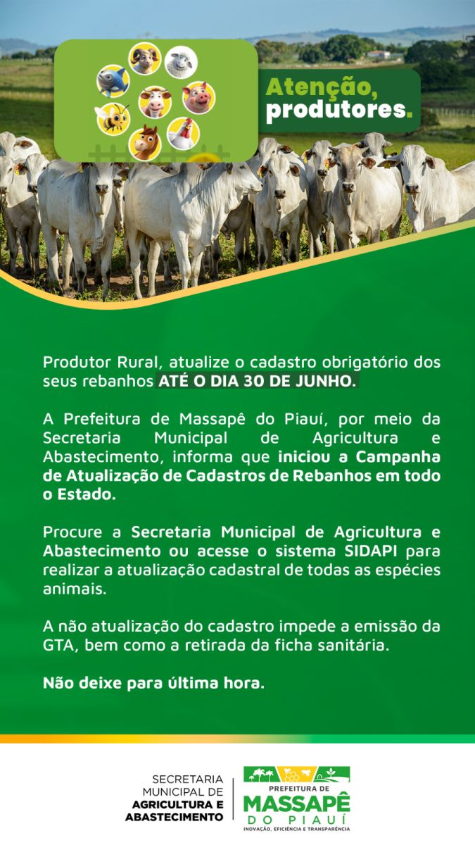 A Prefeitura de Massapê do Piauí, por meio da Secretaria Municipal de Agricultura e Abastecimento, iniciou a Campanha de Atualização de Cadastros de Rebanhos, reforçando a obrigatoriedade do procedimento para todos os produtores rurais do município.