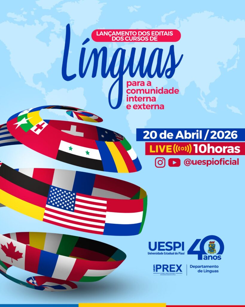 A Universidade Estadual do Piauí (Uespi) vai lançar, nesta segunda-feira (20), às 10h, quatro editais voltados à área de línguas. Um dos editais vai ofertar 1.180 vagas para cursos de línguas online e presencial (espanhol, francês, inglês, libras e português). O lançamento ocorrerá no auditório Central da UESPI, campus Poeta Torquato Neto, em Teresina.