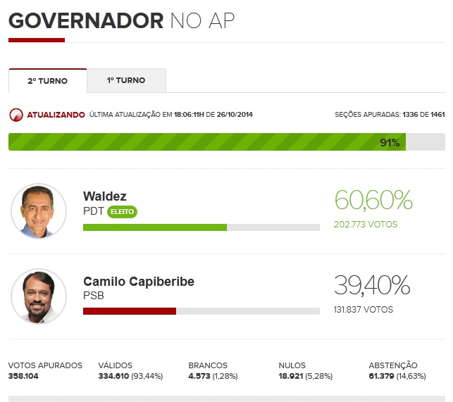 Waldez venceu o candidato Camilo Capiberibe, do PSB. Resultado foi divulgado com 91% das urnas apuradas.