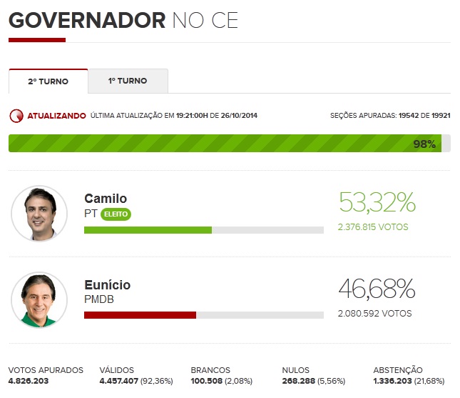 Camilo venceu o candidato Eunício, do PMDB. Resultado foi divulgado com 98% das urnas apuradas.