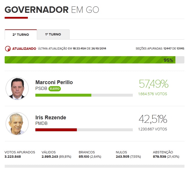 Perillo venceu o candidato Iris Rezende , do PMDB. Resultado foi divulgado com 97% das urnas apuradas.