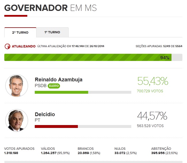 ::: Reinaldo Azambuja (PSDB) é eleito governador do Mato Grosso do Sul.