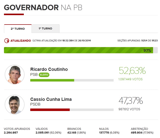 Coutinho venceu o candidato Cassio Cunha Lima, do PSDB. Resultado foi divulgado com 97% das urnas apuradas.