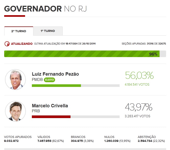 ::: Luiz Fernando Pezão (PMDB) é eleito governador do Rio de Janeiro.