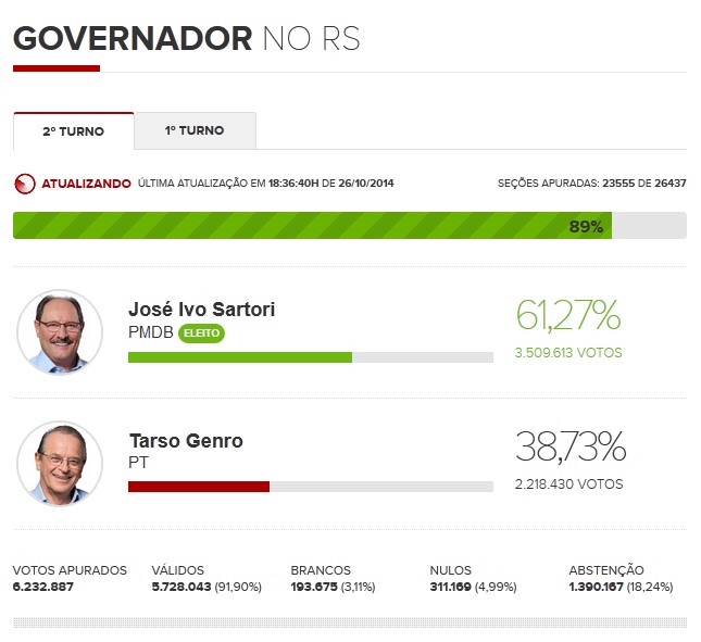 Sartori venceu o candidato Tarso Genro, do PT. Resultado foi divulgado com 89% das urnas apuradas.